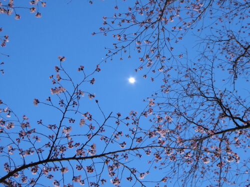 桜の輪で守られたお月様。 群青色の空と淡いピンク色をした桜の中で輝く。 その斜め上では、木星も小さく輝く。 そして西の空には、金星が輝いていた。 夜桜日和。 -2015.3.30. 京都府立植物園にて-