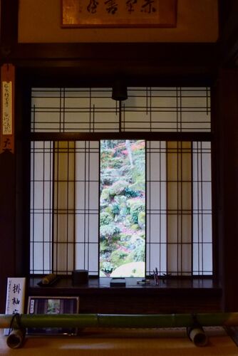 障子の間から見える庭園は、日々変化する掛け軸。 ここに座って写経をしたならば、心穏やかになりそうだ。 -教林坊にて-