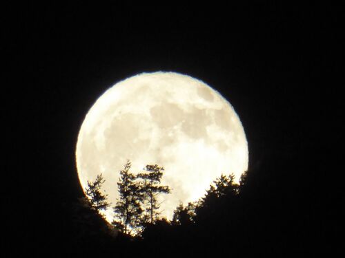 東の空を見ると、ちょうどお月様が出てくるところだった。 木々の向こうに見えるフルムーン。 まるで昔にみた映画の1シーンのよう…。 ほら、音楽まで流れてきそうよ♪ ^-^ 10月25日の満月。
