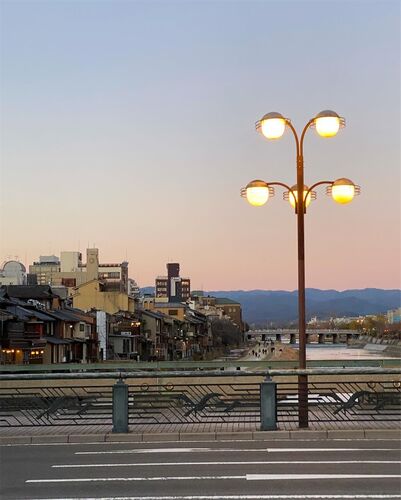 四条大橋 一羽のコサギが 南へと飛んでいった。 みんな南のねぐらに帰っていく。 南座と東華菜館