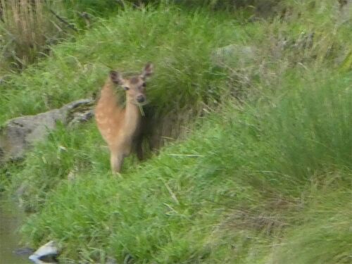 夕方、よおく目をこらしてみたら、鹿がいた。 2頭いる。 このコと このコ。 ずいぶんと離れていたけれど、なんだか目があったきがする、笑。 このコもカメラ目線。 手前ではカルガモが2羽。 橋の欄干にはセグロセキレイが止まっていた。 (おまけ) 買い物…