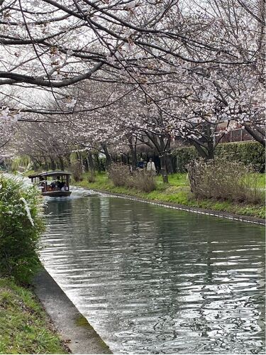 伏見の酒蔵のそばを 十石舟「秀吉」が通る。 桜も少し咲きはじめ昔、ここを十石船が行き来していたことに思いを馳せながら 桜を愛でた。 富翁雪柳も満開。